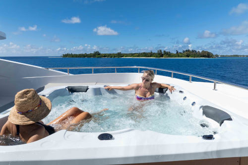 Princess Maani is one of the newest dive yachts in the Maldives. Her maiden voyage was held in November 2024. This 42-meter ship offers 14 cabins and accommodated 28 divers. The Maani is full of comfortable spaces and features. The cabins located on three decks are large with ensuite bath, warm shower, and windows. The ship also features two jacuzzis, a sundeck, cocktail bar, and al fresco dining.
