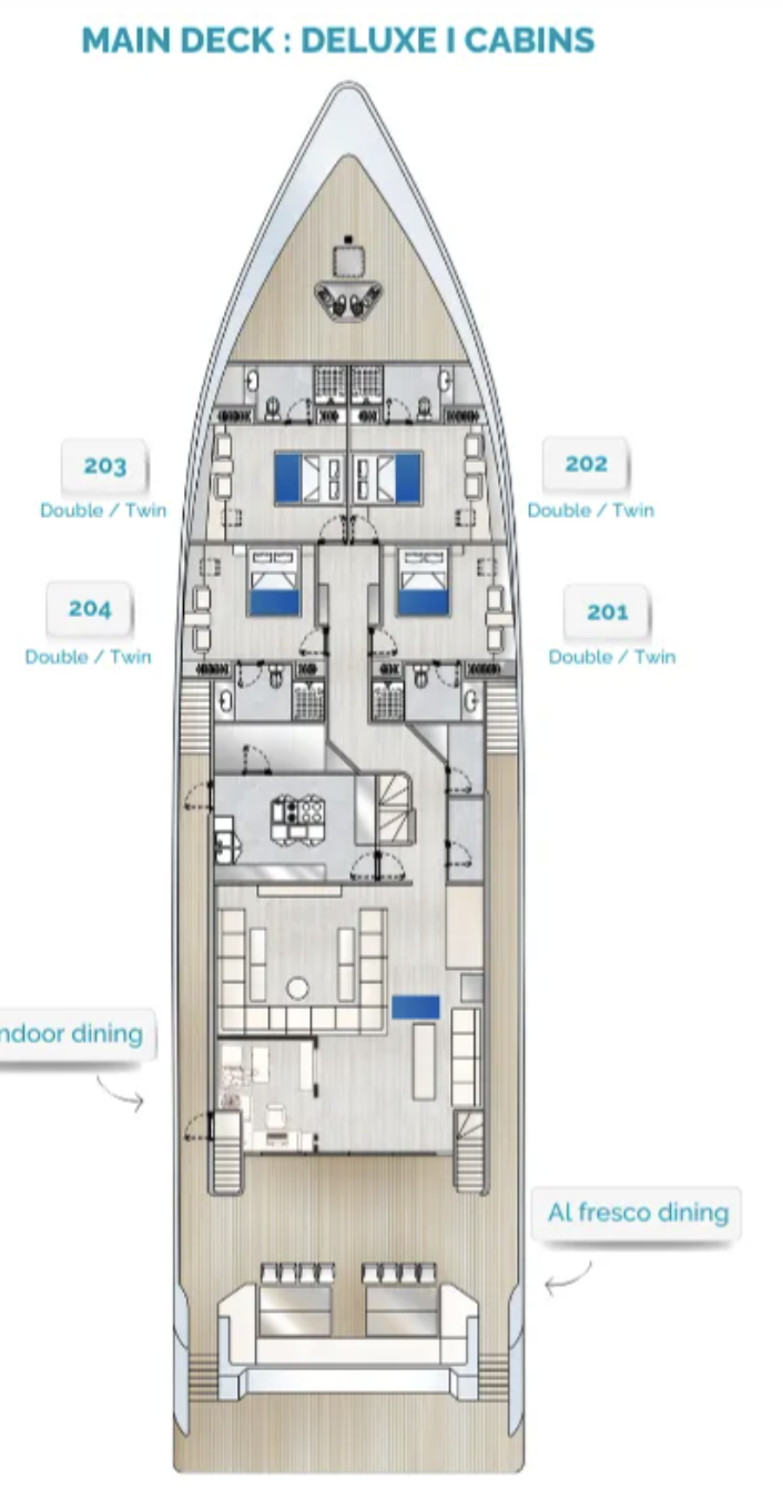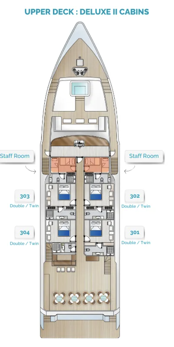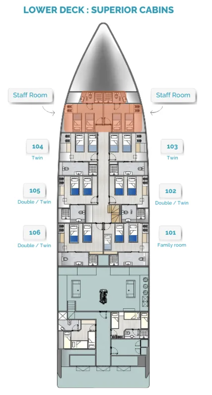 - Cabins stocked with towels, toiletries, and reef-safe sunscreen.