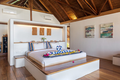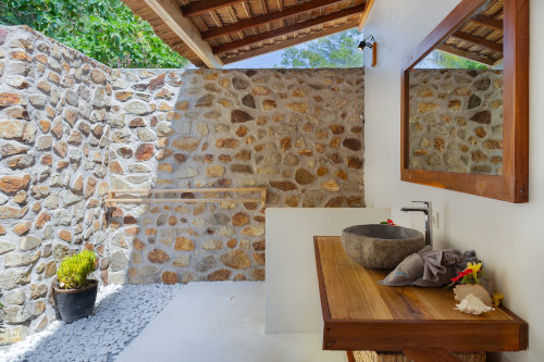 Set among tropical foliage, the Garden Villas offer a quiet escape with generous space arranged across two levels. The lower floor includes a wide deck with a desk and a cozy daybed, perfect for enjoying the breeze or easing into the morning with a cup of coffee. The upper level features a king-size bed positioned to take in peaceful views of the garden and distant ocean, along with a private balcony for unwinding outdoors. Each villa also includes an open, Balinese bathroom with a rain shower, creating a refreshing, natural experience throughout your stay.