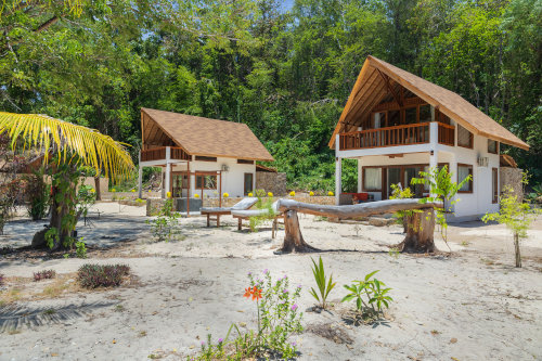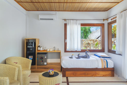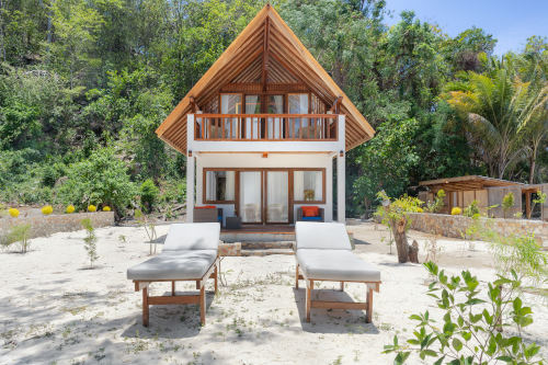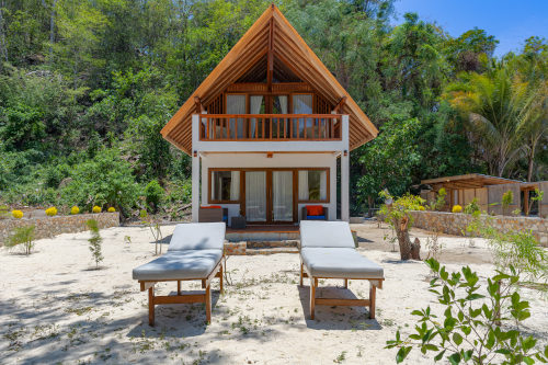 Saronde’s six beachfront villas sit steps from the shoreline, offering a private retreat with uninterrupted ocean views. Each villa includes air conditioning, a comfortable sleeping space, and a Balinese bathroom with a rain shower surrounded by natural greenery. A small minibar and a coffee/snack corner adds simple convenience to your stay. An ideal place to read and relax or watch the tide move in and out, every villa features its own private beach area complete with a patio, sunbeds, a dining table, and a cushioned daybed.